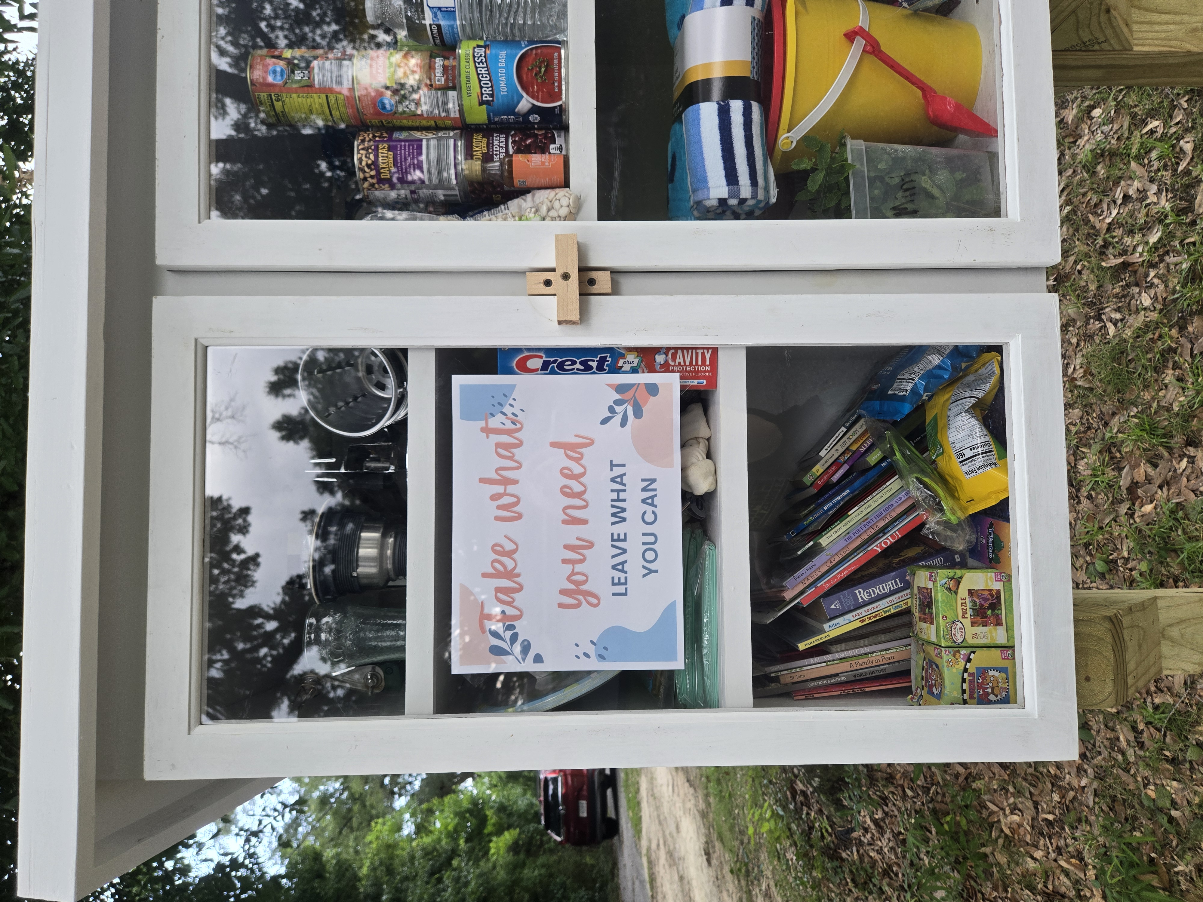 Free little pantry, library and community share. All are welcome. Take what you need, leave what you can