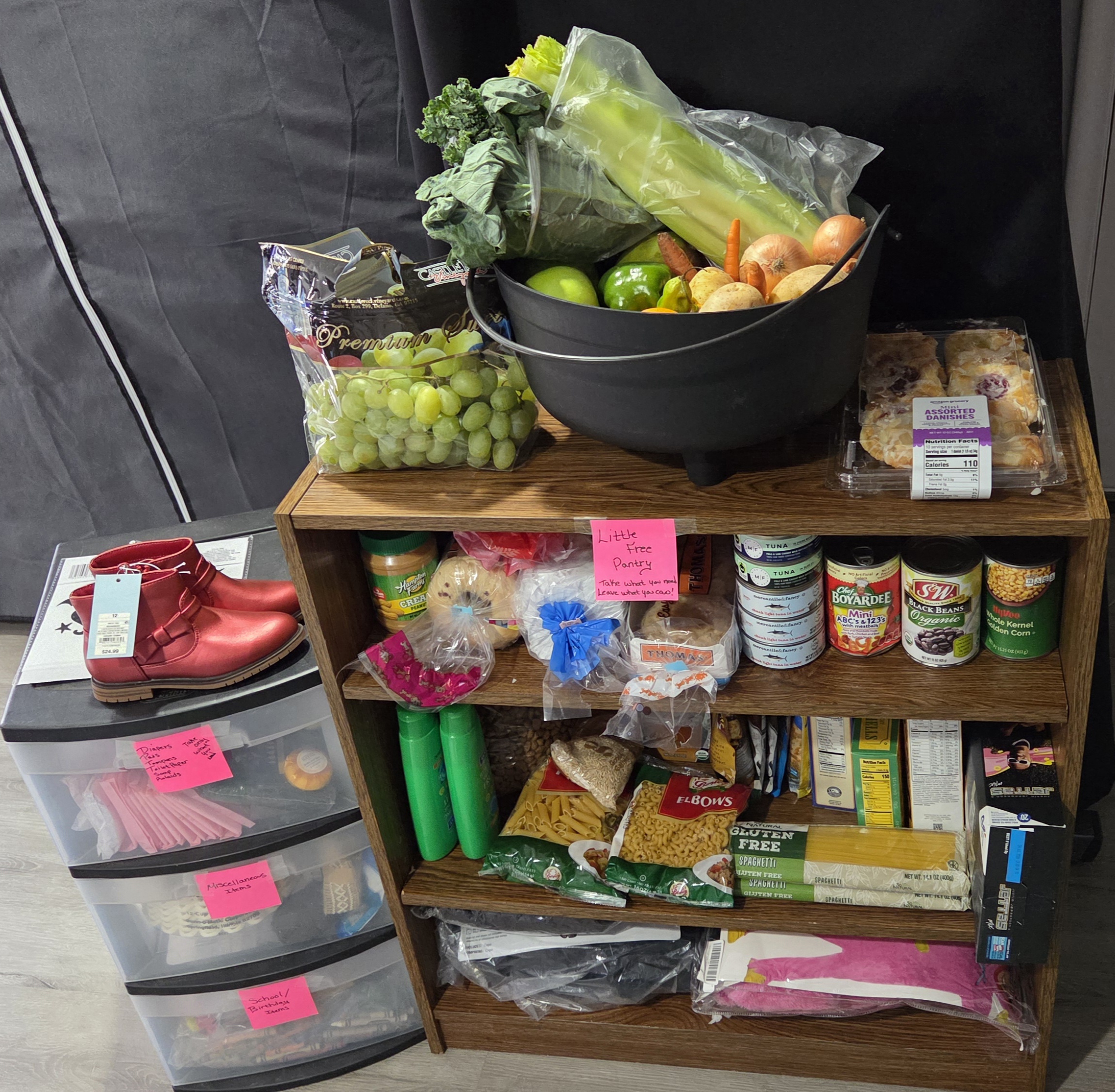 | Description | We have bread, pastries, canned goods, shelf stable goods, vegetables, fruit, hygeine products, dog food, costumes, clothes, shoes, toys, books, miscellaneous items. |