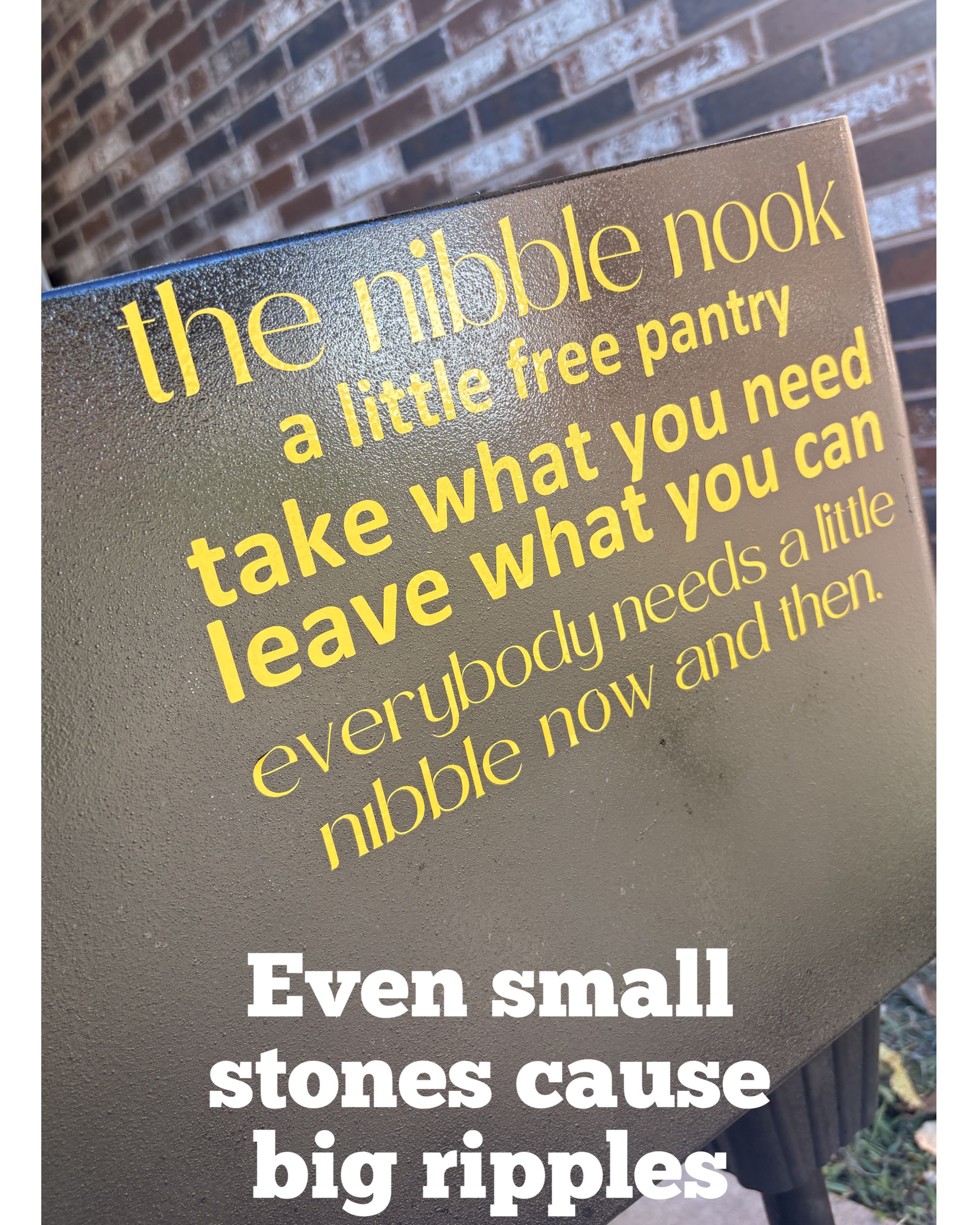 | Description | Our neighborhood will work to keep this stocked with non perishables to supplement meals, provide snacks, and otherwise meet needs as we’re able. The Nibble Nook is open to anyone. |
