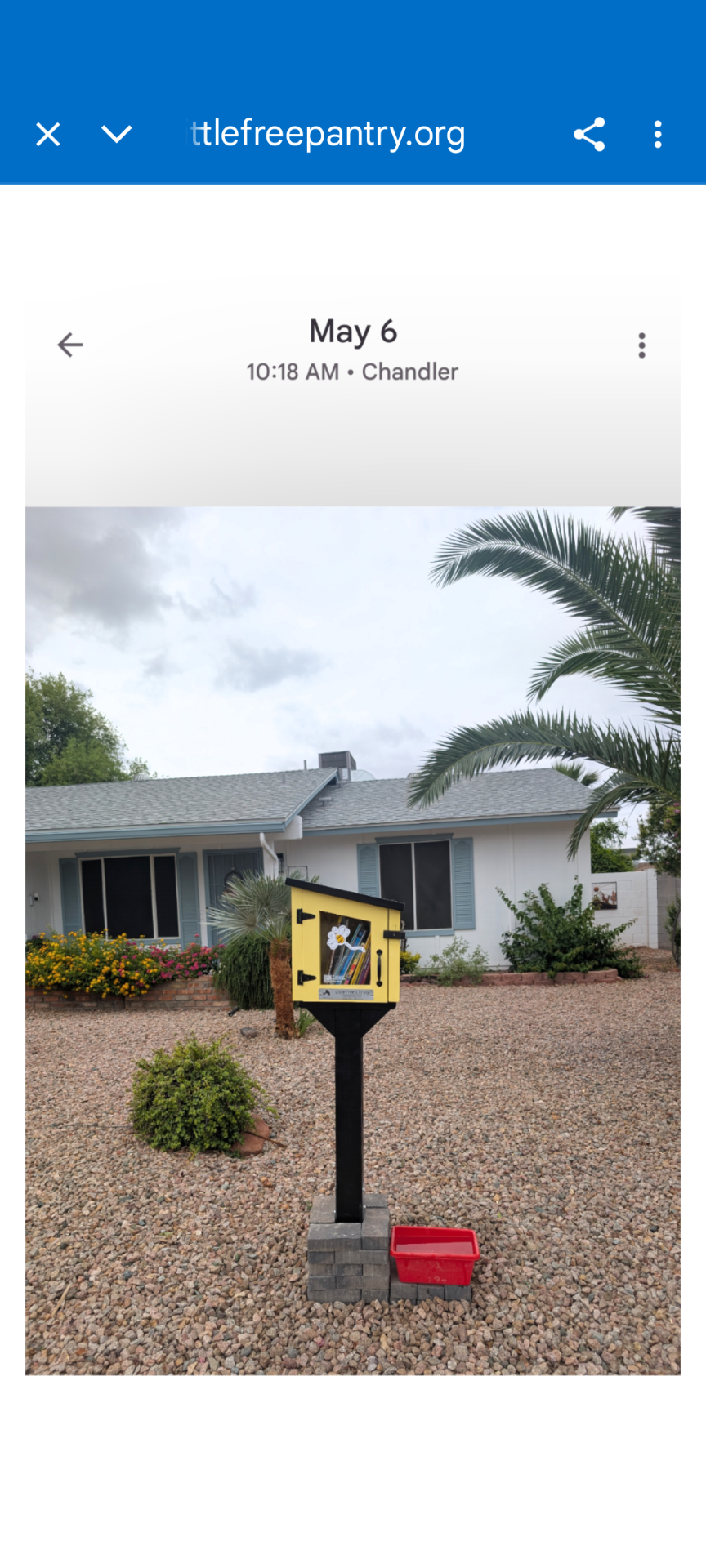 | Description | We have temporarily converted our Little Free Library into a Free Food Pantry throughout the rest of 2025. It has coffee, cereal, dried fruit, Kraft Mac and Cheese, cans of soup, pasta and pasta sauce. Please feel free to take what is needed, even if it's everything. It will be restocked as needed. |