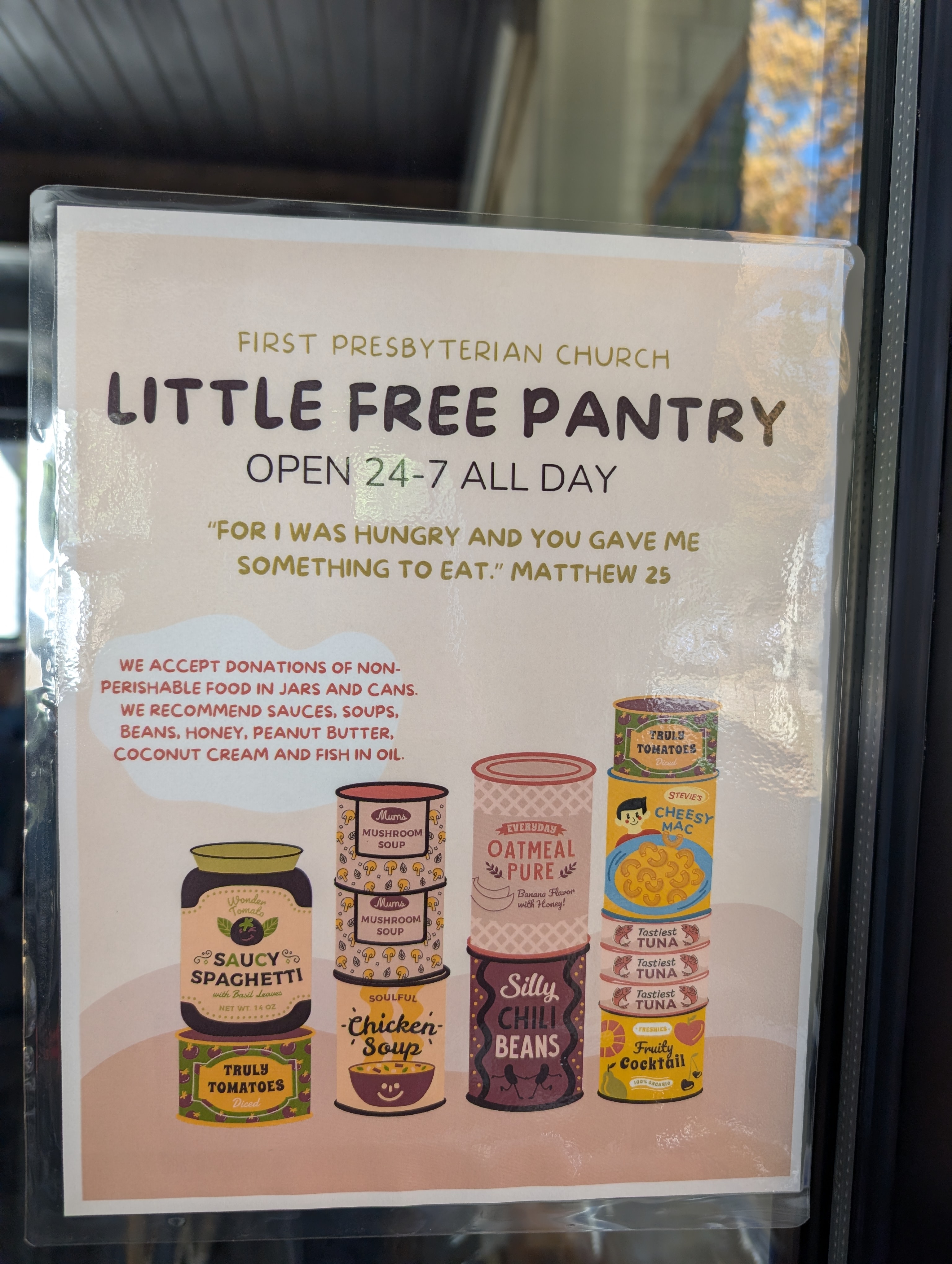 | Description | Little Free Pantry open 24/7 All Day. Please feel free to take what you need. If you are interesting in giving, we accept donations of non-perishable food in jars and cans. We recommend sauces, soups, beans, honey, peanut butter, coconut cream, and fish in oil. |