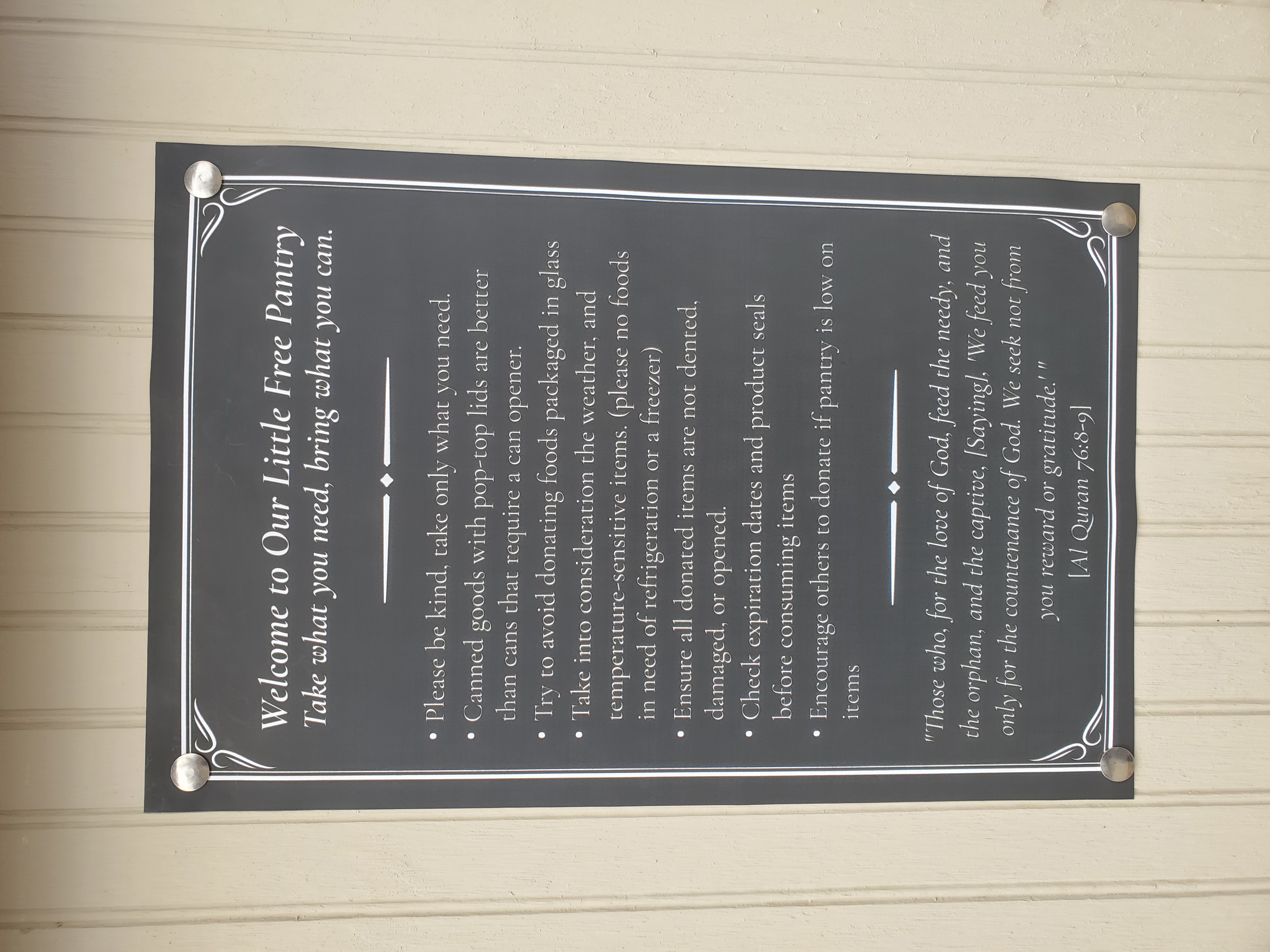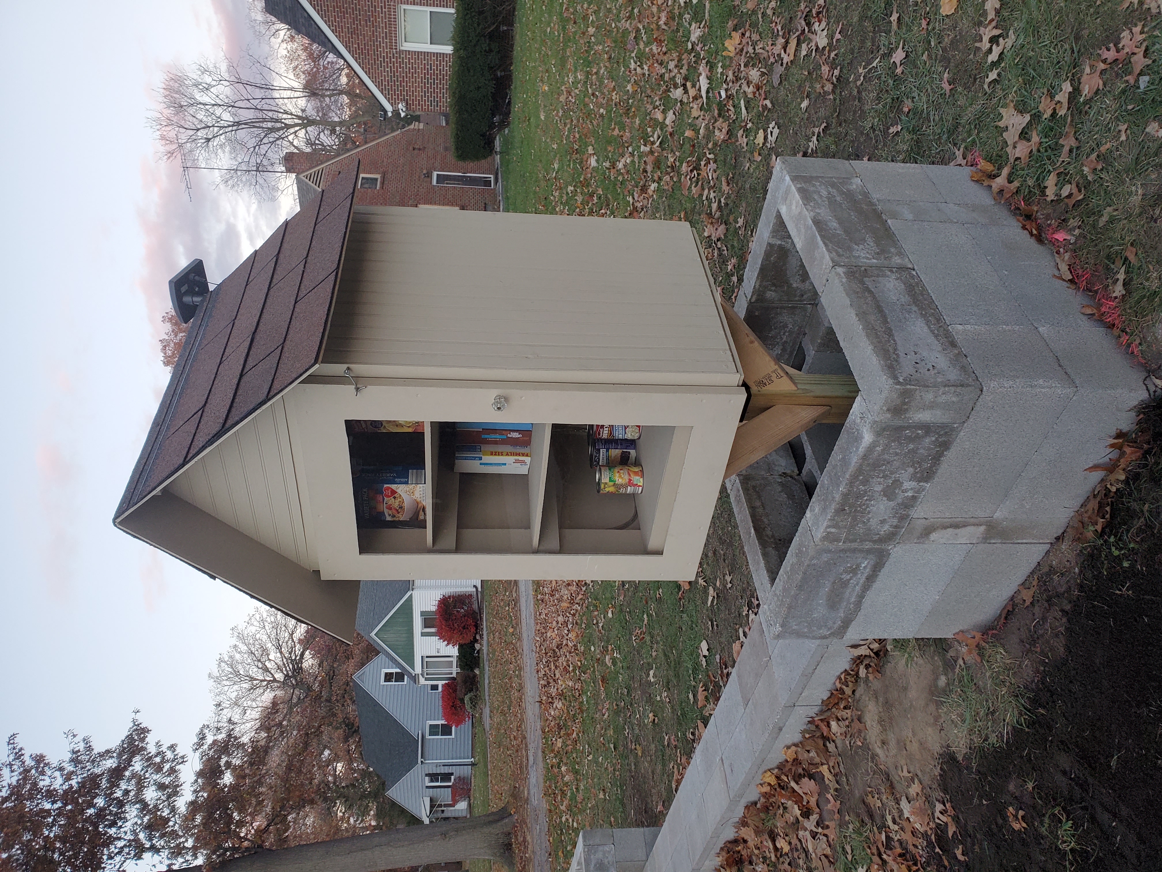 | Description | This pantry is outside of a personal residence, but is available 24/7, right near the road. There is even a little light inside, so that it's easily accessible at night. There are mainly food items in this pantry, but donations have also included personal hygiene and baby products (toothbrushes, diapers, formula, baby wipes) |