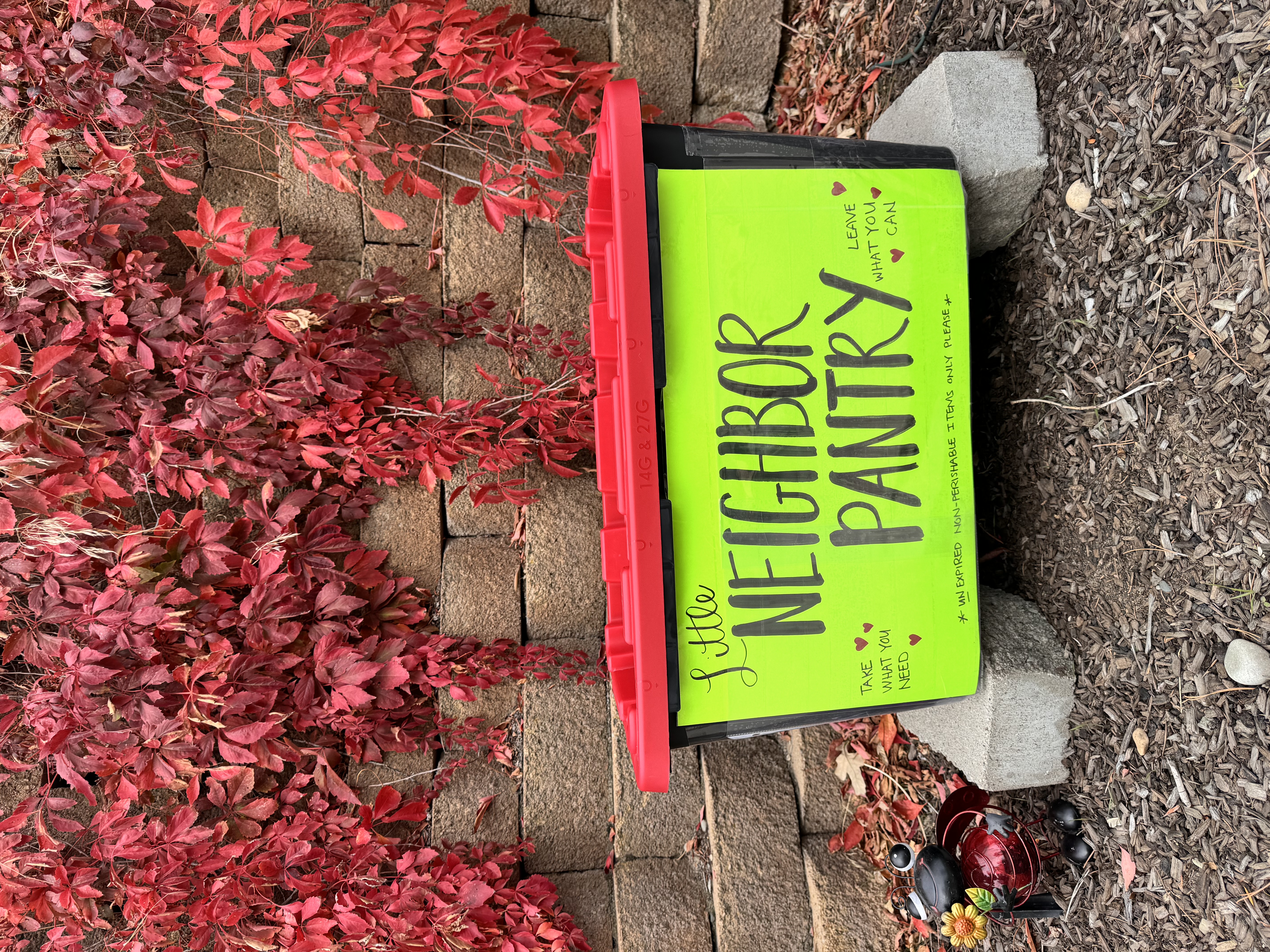 | Description | Small bin with food available for the taking. Take what you need, leave what you can. |