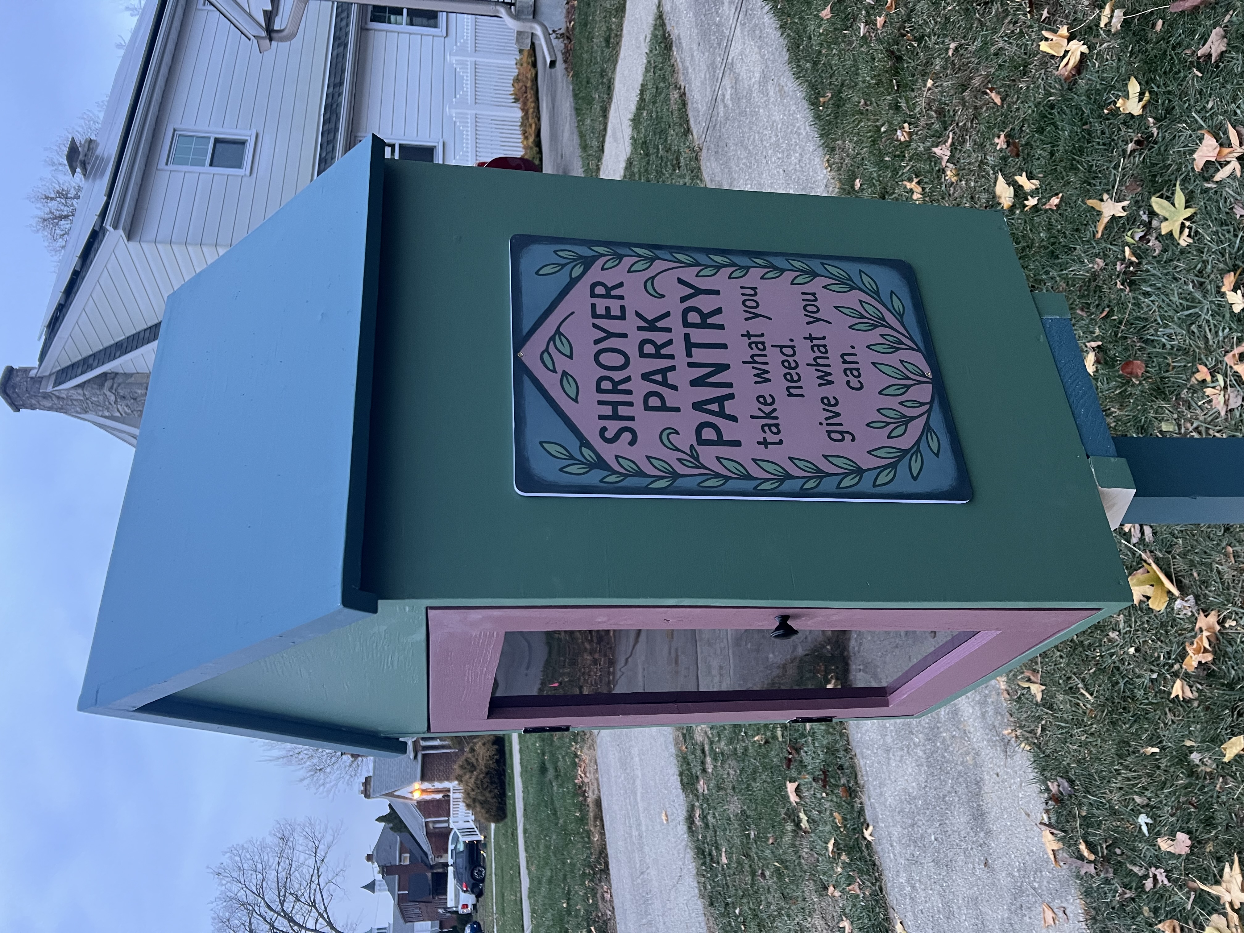 Little Free Pantry in the Shroyer Park neighborhood of Dayton, Ohio. If possible, please park on a side street and walk to the pantry to avoid stopping on the main road. Overage of donations (which would be amazing!) can be placed on the front porch. |
