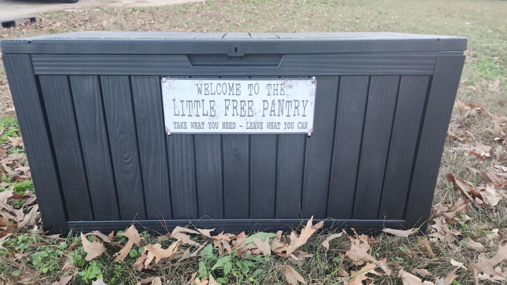 | Description | Brown parcel box with little free pantry sign on it. At end of the road, near our mailbox. Leave what you can, take what you need. Free. |