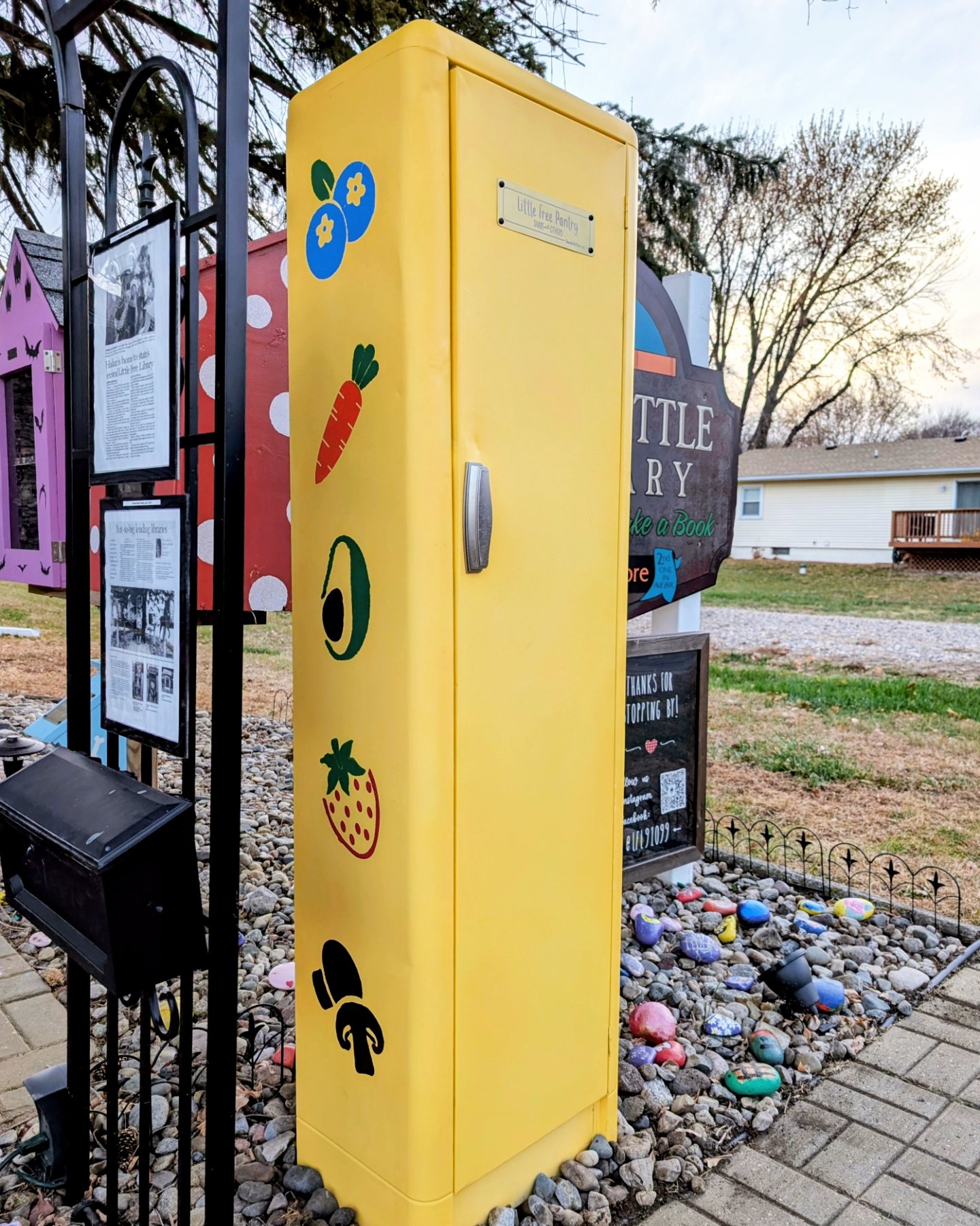 | Description | A tall yellow cabinet located at the Little Free Library of Hadar. Take what you need and leave what you can! Please leave only nonperishable foods and hygiene products. |