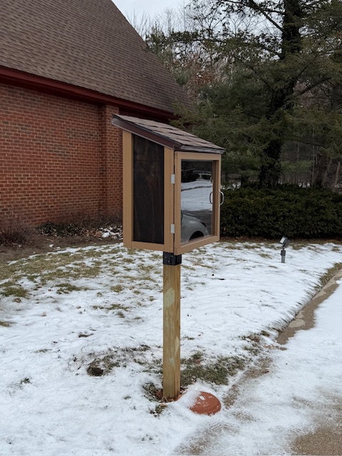 | Description | It is a dark-brown wooden box along the parkway on the east side of the church. It faces south along Park Drive. |