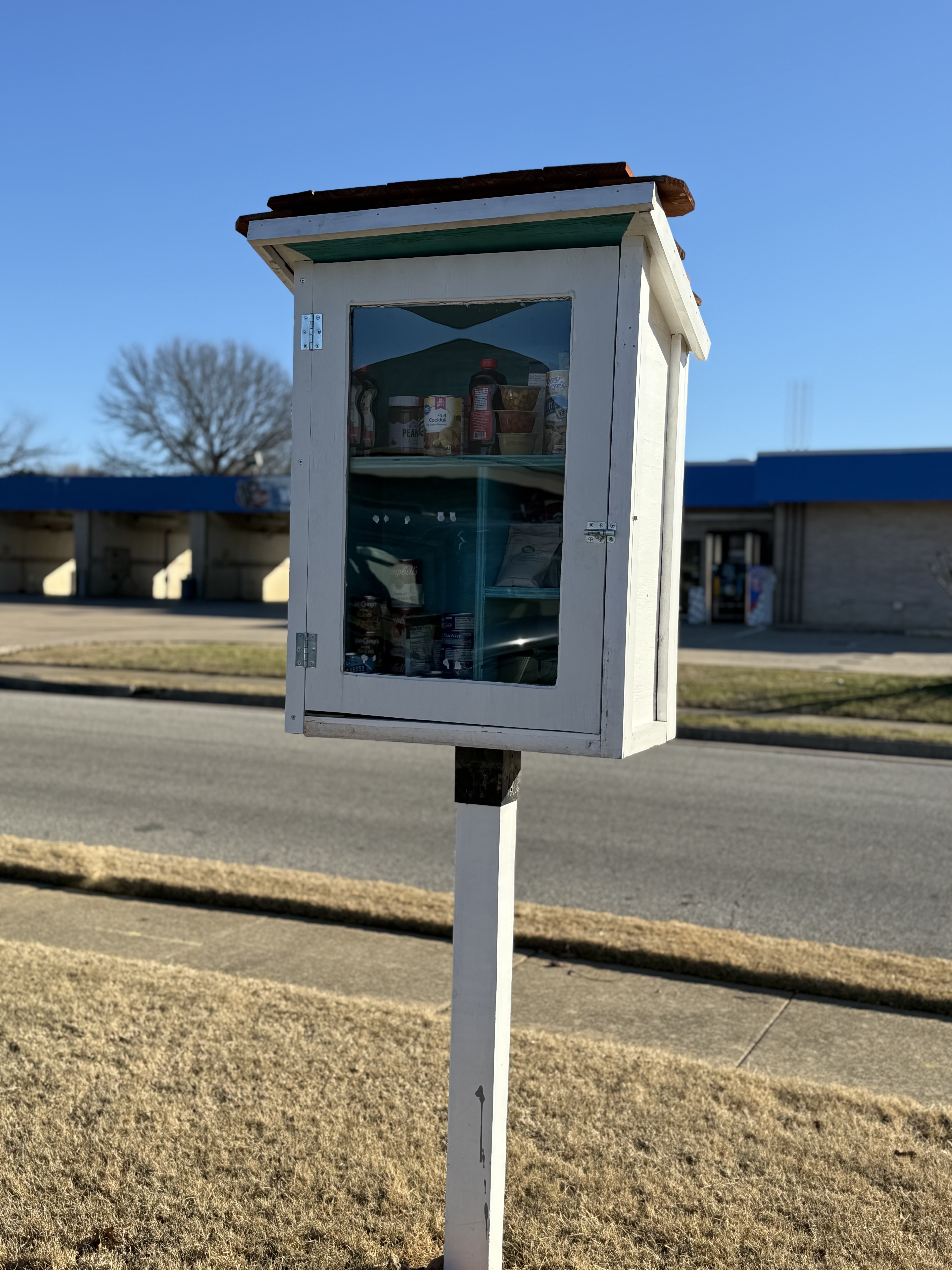 | Description | Little Food Pantry containing basic needs; canned food, soup, canned fruit, rice/potato packets/boxes, feminine products, and other quick heat items, |